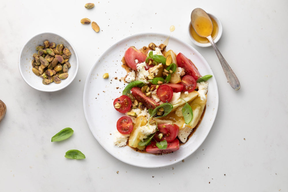 Food-Styling: Tomaten-Mozzarella-Salat mit Honig & Pistazien