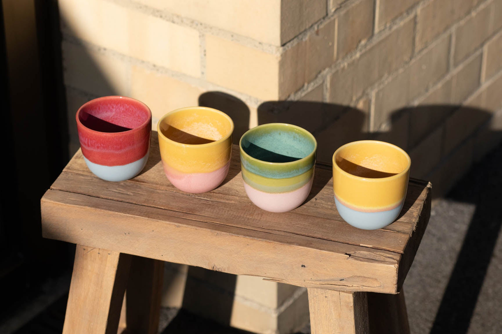 Die Espressotassen der Color Block Kollektion sind in vier Farbkombinationen erhältlich: Gelb/Rosa, Grün/Rosa, Rot/Hellblau und Gelb/Hellblau – jede Tasse ein stylisches Highlight für Zuhause oder Büro.