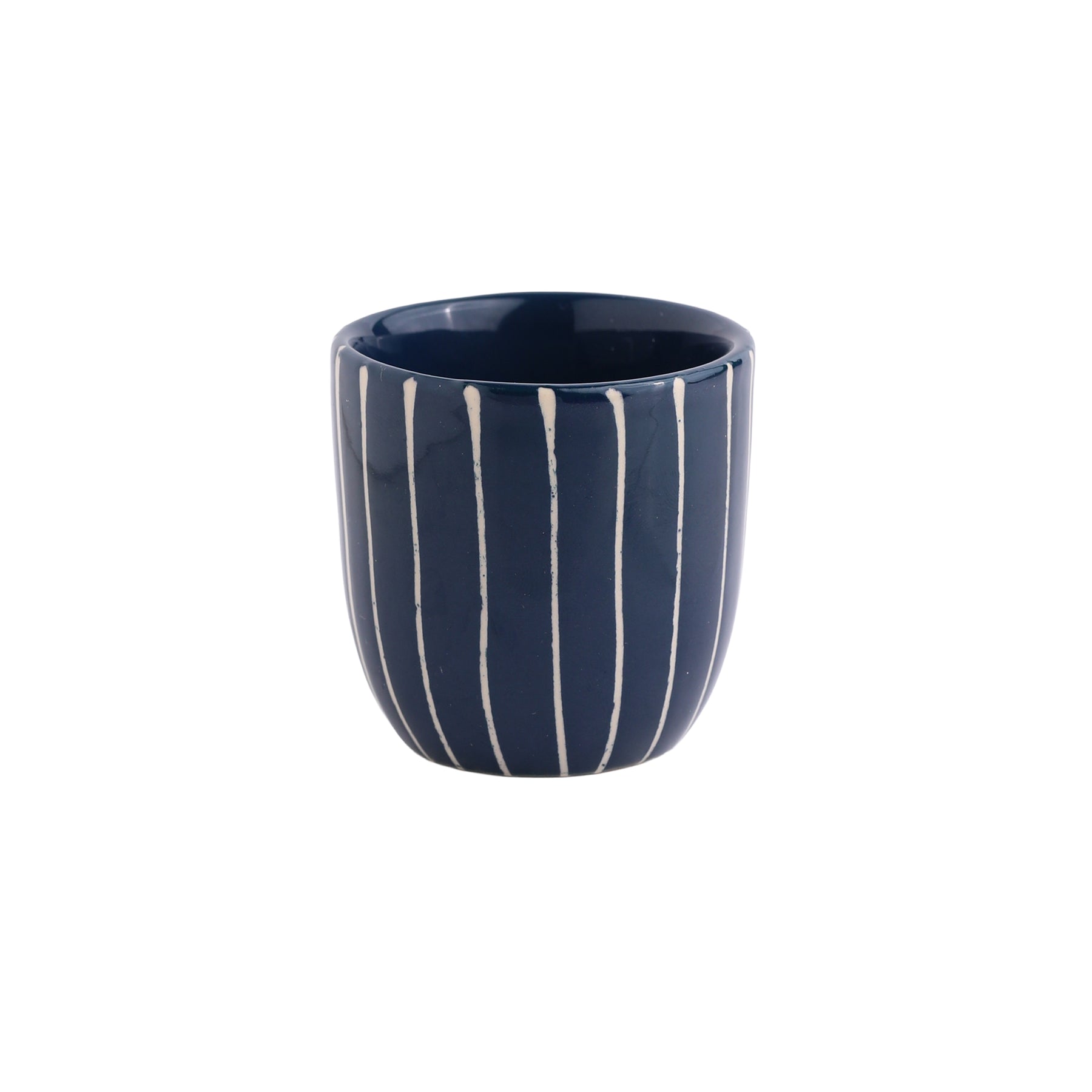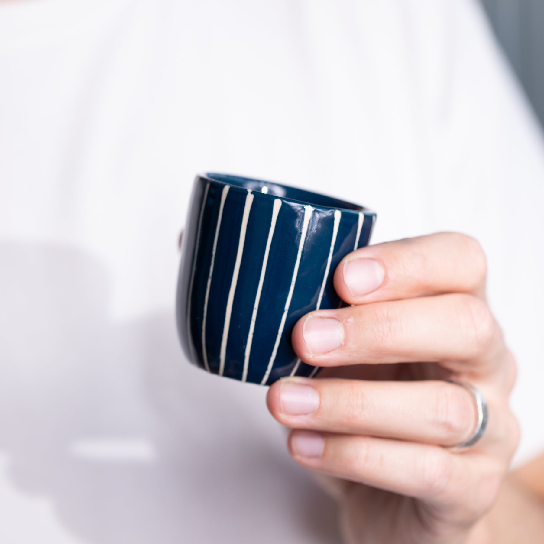 Unsere Espresso Tasse in dunkelblau mit weissen Streifen kombiniert minimalistisches Design mit handwerklicher Präzision. Die feinen weissen Streifen entstehen durch ein Wachsverfahren, bei dem Wachs vor dem Glasieren aufgetragen wird – so bleibt der Ton an diesen Stellen naturhell. Das tiefe Blau der Glasur und die klare Linienstruktur machen jede Tasse zu einem Einzelstück.